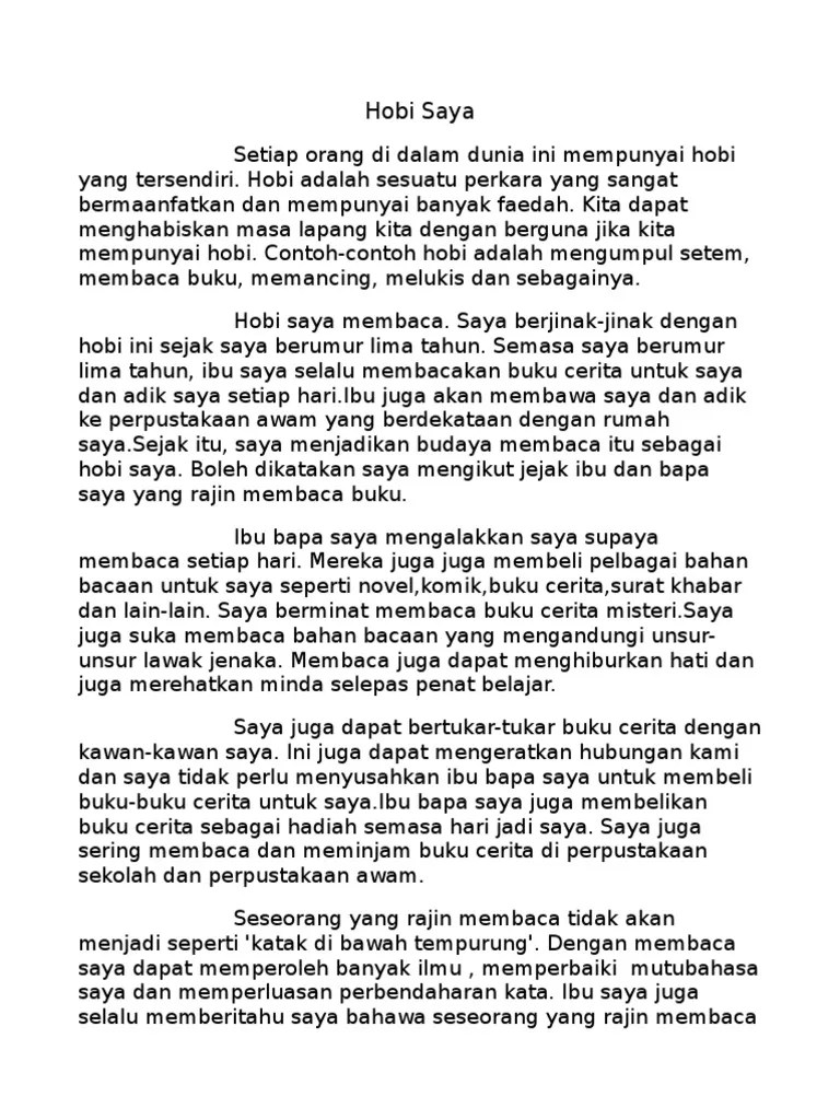 Mohd azizi bin wahaid moe. Contoh karangan hari ibu rasmi u setiap orang pasti mempunyai hobi yang tersendiri. Karangan e mel flip ebook pages 1 2 . Hobi saya · skateboarding · melukis · menyanyi · memancing · membaca buku · mengumpul setem · melayari internet. Bahasa melayu tahun 5 (karangan hobi saya). Ramai orang mempunyai hobi sendiri. Setem, membaca buku, memancing, melukis dan sebagainya. Sebelum melukis, saya gambarkan dahulu rupa pantai yang hendak dilukis berdasarkan pengamatan saya ketika pergi melancong. Saya juga mempunyai hobi iaitu bermain bola sepak. Itu membuat saya berkhayal, bahwa ada kota di bawah laut dan penduduknya adalah ikan.